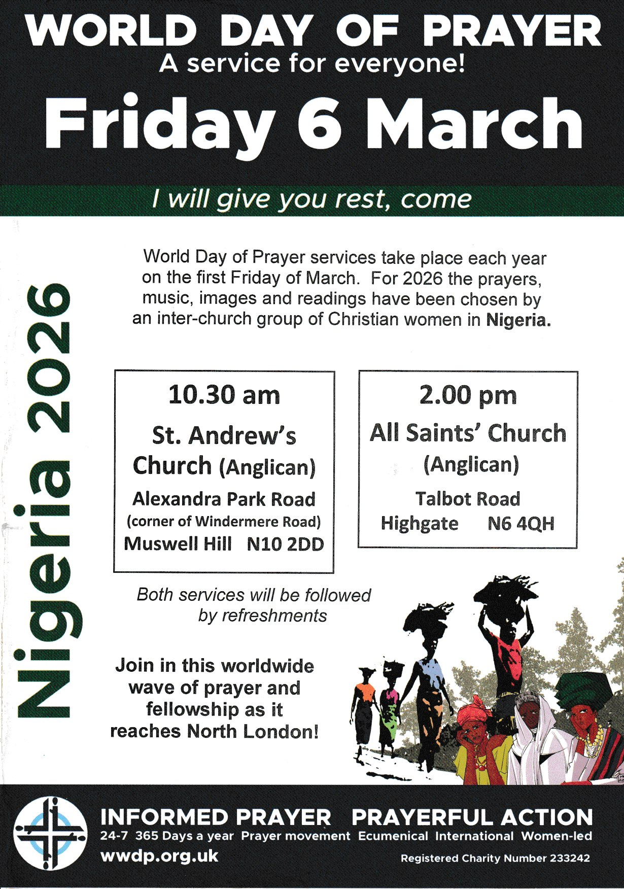 This year Highgate’s World Day of Prayer service will be held at All Saints’. It will be part of an international wave of prayer, which focuses on a different country each year. This year the focus is on Nigeria.. You are very welcome to join us to learn a little about what it is like to live in Nigeria and to pray with and for its people.